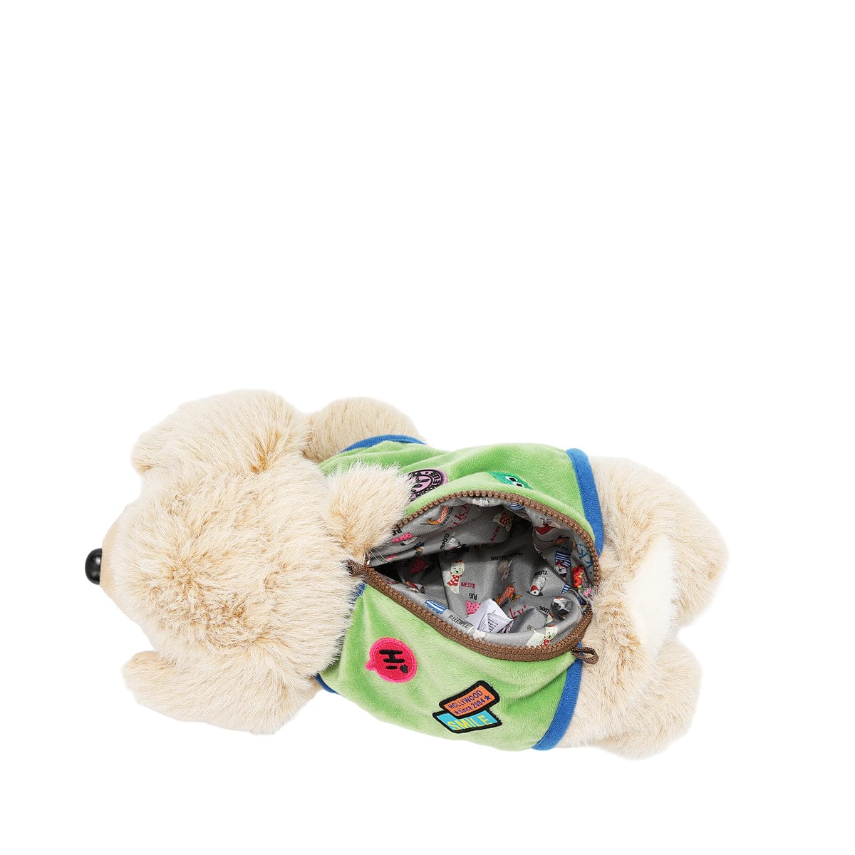 - Fabricado en piel sintética tipo peluche y poliéster.